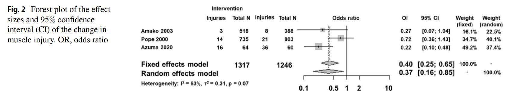 „For muscle injuries, the result of the meta-analysis showed that the static stretching intervention group significantly decreased muscle injuries compared to the control group (odds ratio = 0.37; 95% confidence interval, 0.16–0.85; p < 0.01; I2 = 63%).“